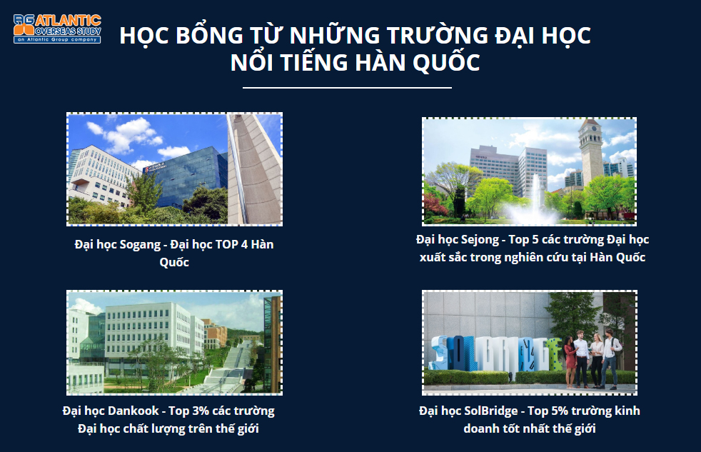 Năm 2020, Atlantic chính thức tổ chức kỳ thi KSE (Korean Scholarship Examination) – Kỳ thi thi tuyển và phỏng vấn học bổng lên đến 100% học phí trị giá gần 1 tỷ đồng đến từ nhiều trường Đại học Top đầu Hàn Quốc: Đại học Sogang, Đại học Dankook, Đại học Sejong, Đại học SolBridge cùng rất nhiều ngôi trường danh giá khác dành cho các bạn học sinh Việt Nam tiềm năng từ lớp 12 trở lên.