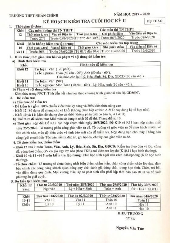 Lịch coi thi học kì II khối 10, 11 năm học 2019 – 2020