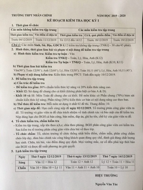 Lịch coi thi học kì II khối 10, 11 năm học 2019 – 2020