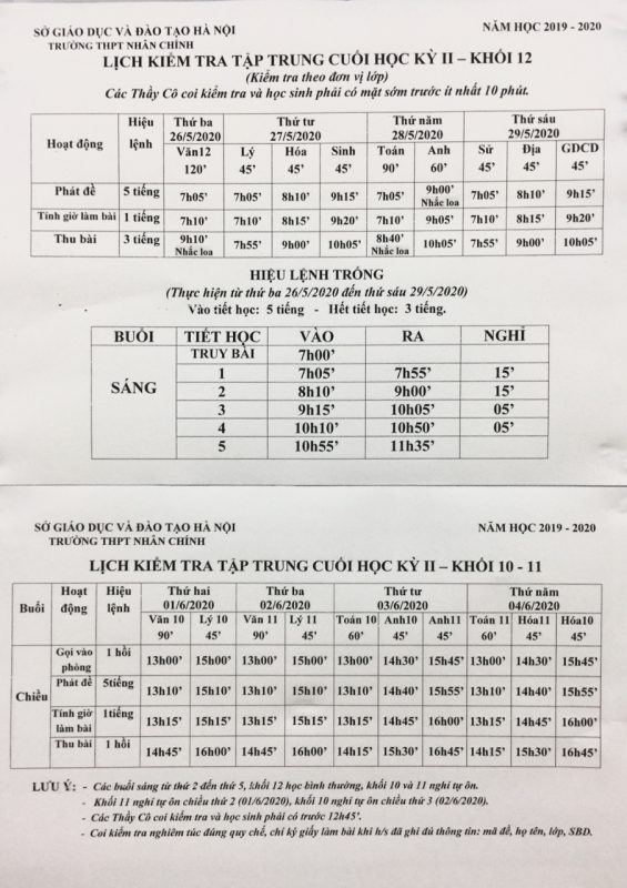 Lịch coi thi học kì II khối 10, 11 năm học 2019 – 2020