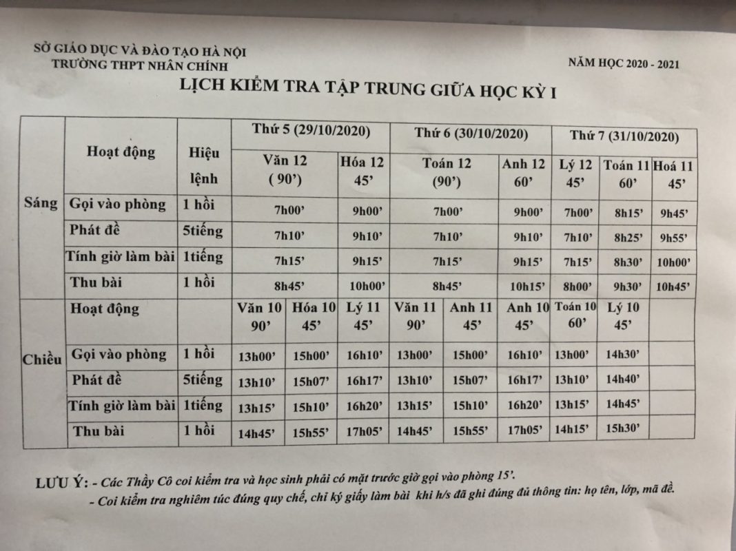 Lịch kiểm tra tập trung cuối học kỳ II năm học 2019 – 2020