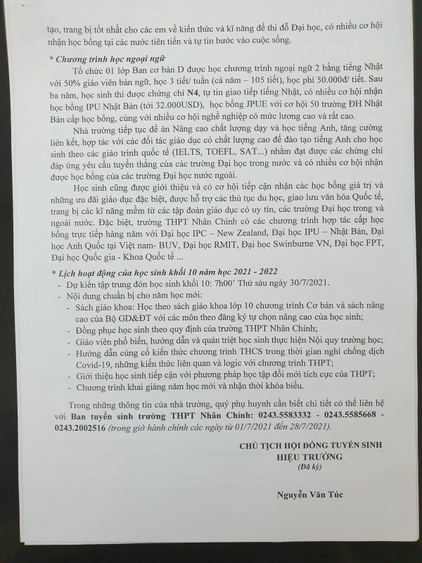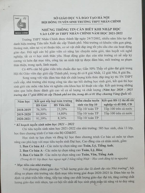 Thông tin tuyển sinh vào lớp 10 trường thpt nhân chính năm học 2021 -2022