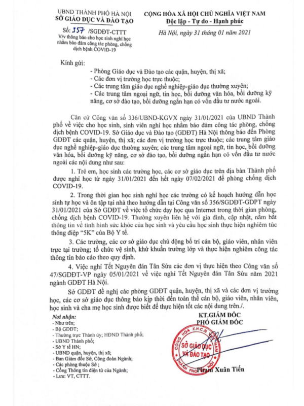 Thông báo cho học sinh tạm dừng đến trường nhằm bảo đảm công tác phòng, chống dịch bệnh Covid – 19