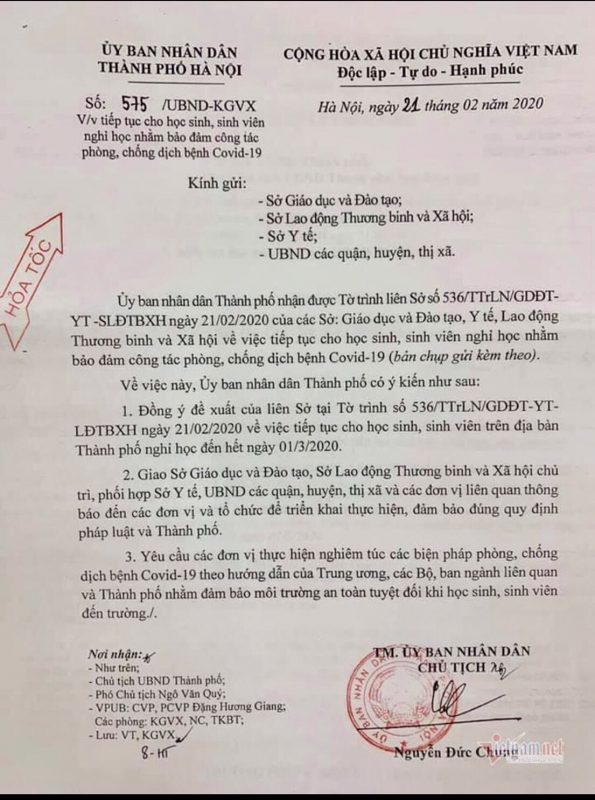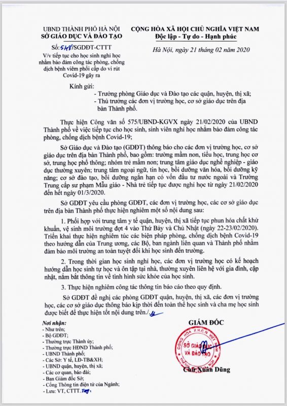 -Thực hiện công văn 548/SGD-CTTT ngày 21/02/2020 của Sở GD&ĐT Hà Nội về việc tiếp tục cho học sinh nghỉ học từ ngày 24/2/2020 đến hết ngày 31/2/2020 nhằm đảm bảo công tác phòng, chống dịch bệnh Covid-19.