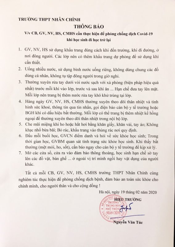 Trường THPT Nhân Chính thông báo về việc phòng chống dịch bệnh do vi rút Corona