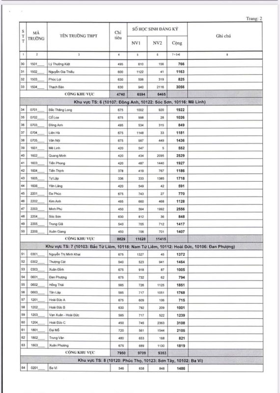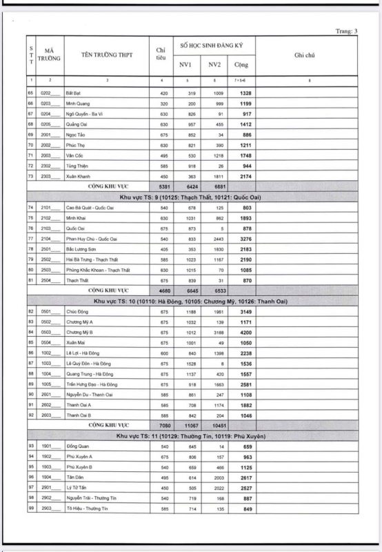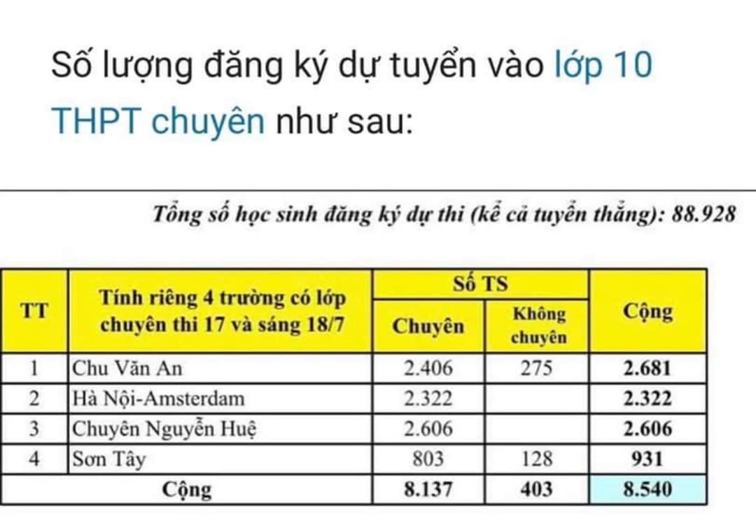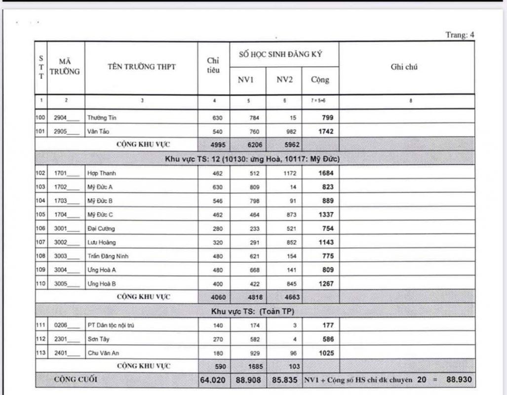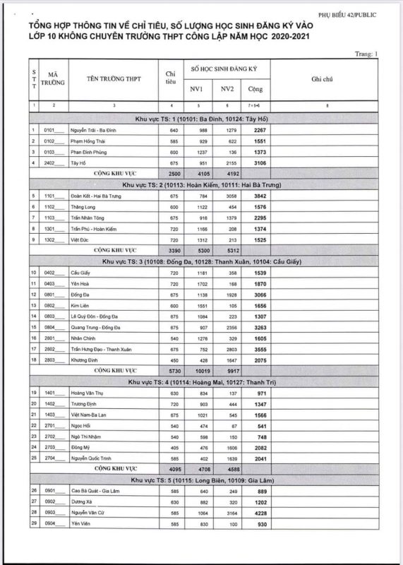 Thống kê số học sinh đăng ký dự tuyển vào lớp 10 THPT các trường công lập năm học 2020-2021