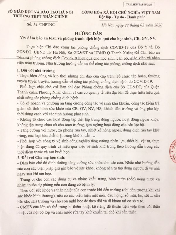 Công bố công khai điều chỉnh số liệu dự án ngân sách năm 2020 của trường thpt nhân chính